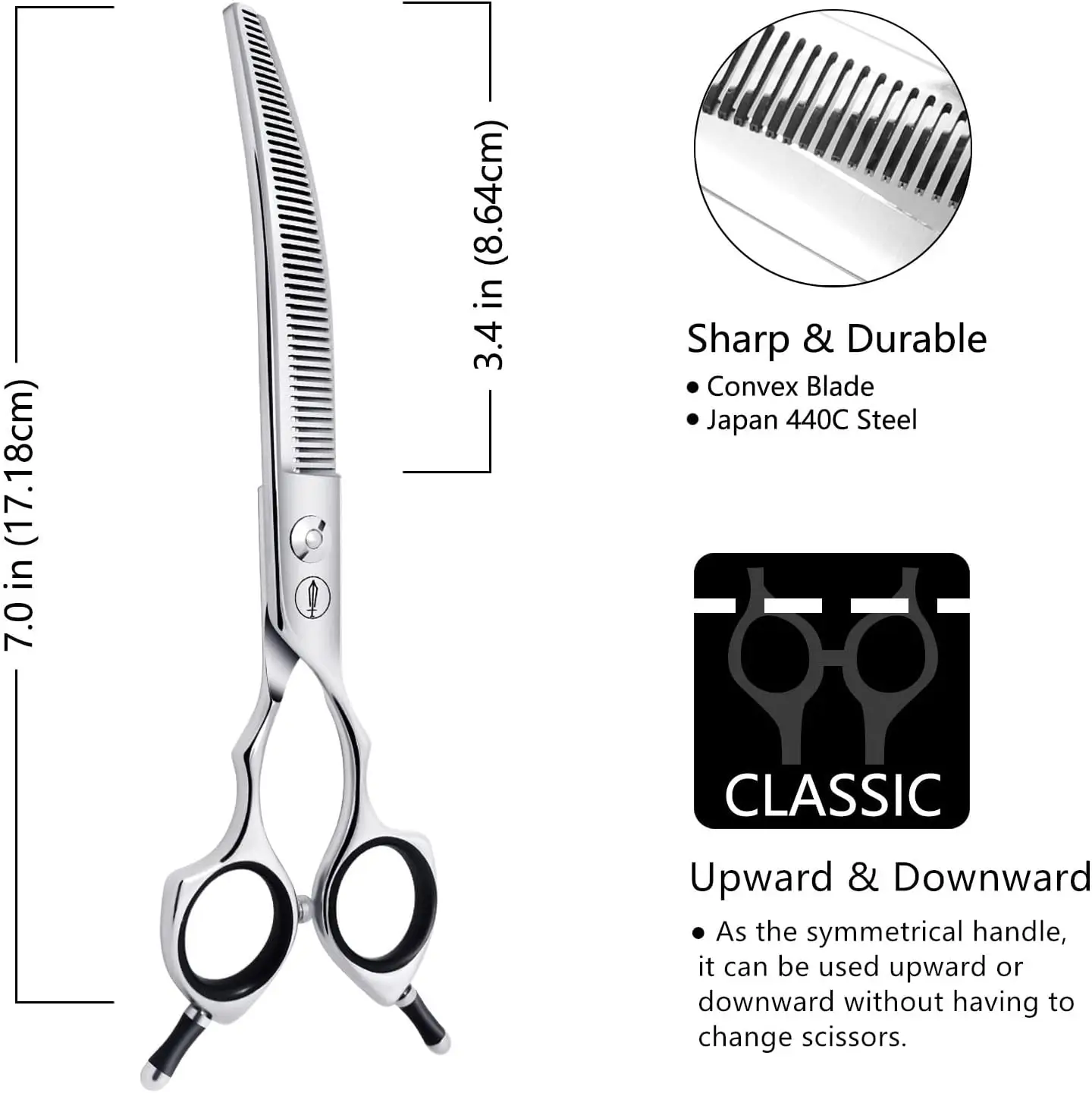 - Tasa de adelgazamiento del 30 %: las tijeras curvas HASHIMOTO para el aseo del perro tienen dientes súper afilados en forma de V. 50 dientes en un lado dan una tasa de adelgazamiento del 25-35%. Se pueden recortar uniformemente con facilidad y es bueno para obtener el grosor sin longitud de corte. Conseguirás resultados impecables cada vez sin ningún daño.